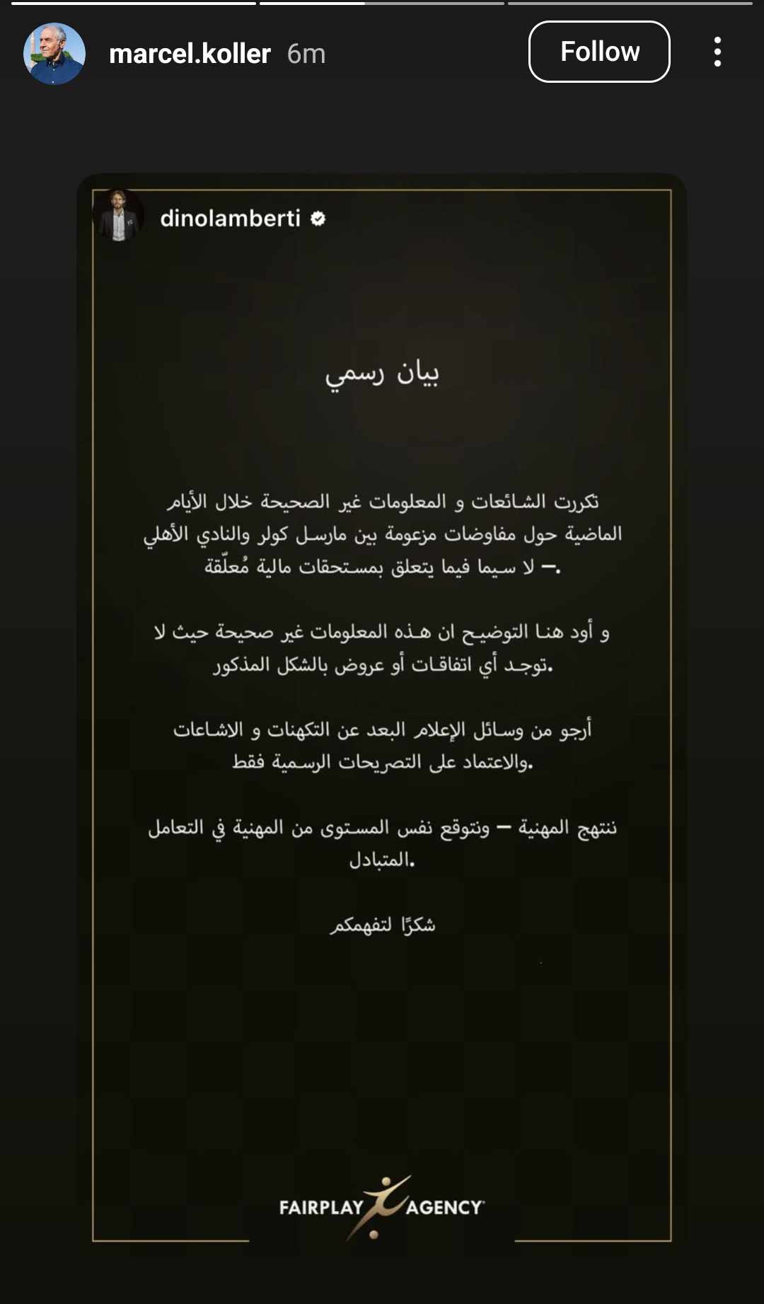 “تكررت الشائعات والمعلومات غير الصحيحة خلال الأيام الماضية حول مفاوضات مزعومة بين مارسيل كولر والنادي الأهلي، لا سيما فيما يتعلق بمستحقات مالية معلقة.