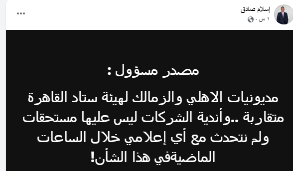 مديونيات الاهلي والزمالك لهيئة ستاد القاهرة متقاربة ..وأندية الشركات ليس عليها مستحقات ولم نتحدث مع أي إعلامي خلال الساعات الماضية في هذا الشأن!
