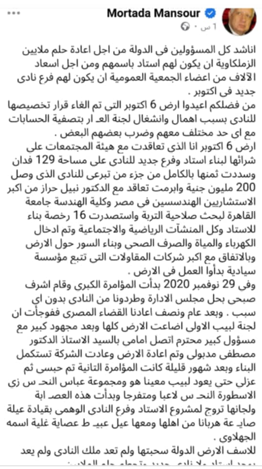 وفي 29 نوفمبر 2020 بدأت المؤامرة الكبري وقام اشرف صبحي بحل مجلس الادارة وطردونا من النادي بدون اي سبب . وبعد عام ونصف اعادنا القضاء المصري ففوجأت ان لجنة لبيب الاولي اضاعت الارض كلها وبعد مجهود كبير مع مسؤول كبير محترم اتصل امامي بالسيد الاستاذ الدكتور مصطفي مدبولي وتم اعادة الارض وعادت الشركة تستكمل البناء وبعد شهور قليلة كانت المؤامرة التانية تم حبسي ثم عزلي حتي يعود لبيب معينا هو ومجموعة عباس النحـ س زي الاسطورة النحـ س لاعبا ومتفرجا وبدأت هذه العصـ ابة ولجانها تروج لمشروع الاستاد وفرع النادي الوهمي بقيادة عيلة صايـ عة هربانا من اهلها ومعها عيل عبيـ ط عصاية غلية اسمه الجهلاوي .