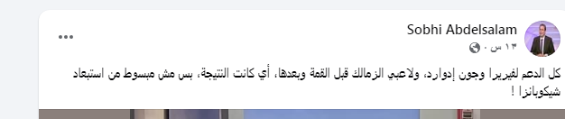كل الدعم لفيريرا وجون إدوارد، ولاعبي الزمالك قبل القمة وبعدها، أي كانت النتيجة، بس مش مبسوط من استبعاد شيكوبانزا !