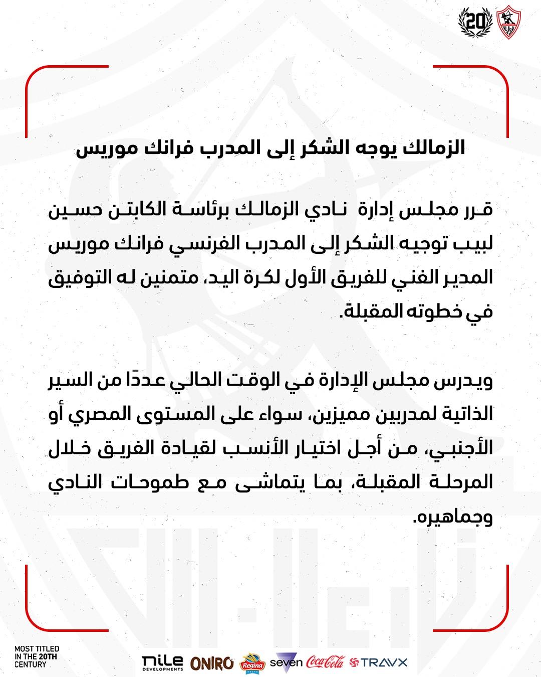 قرر مجلس إدارة نادي الزمالك برئاسة حسين لبيب توجيه الشكر إلى المدرب الفرنسي فرانك موريس، المدير الفني للفريق الأول لكرة اليد