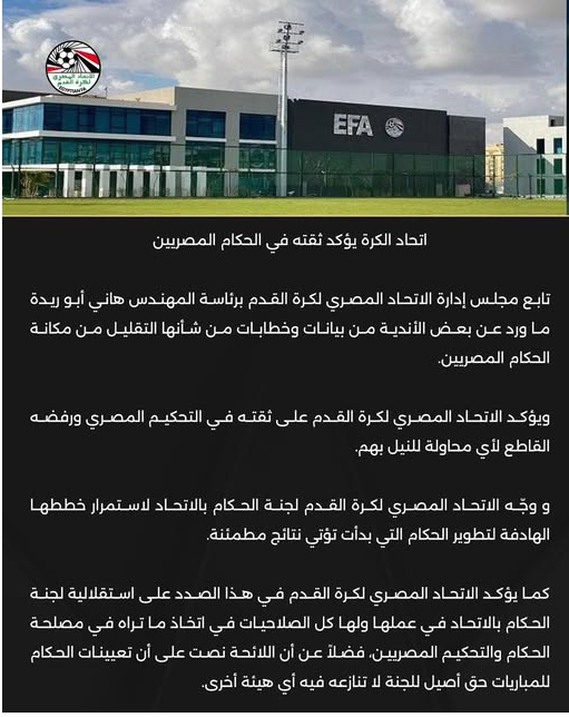 وشدد الاتحاد على ثقته الكاملة في منظومة التحكيم المصري ورفضه القاطع لأي محاولات تهدف للنيل منهم أو التشكيك في قدراتهم.