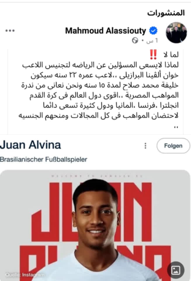 طلب محمود الاسيوطى مالك ورئيس نادي لافيينا بمنح الجنسية المصرية لـ البرازيلى خوان الفينا لاعب الزمالك.