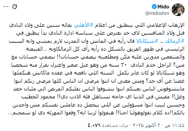 وعبر صفحته الشخصية على موقع التواصل الاجتماعى إكس كتب ميدو قائلاً :
