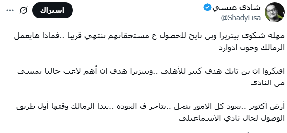 حذر النادي الرياضي شادي عيسى نادي الزمالك من أزمات مستحقات اللاعبين سواء للاعبين انفسهم او أنديتهم السابقة