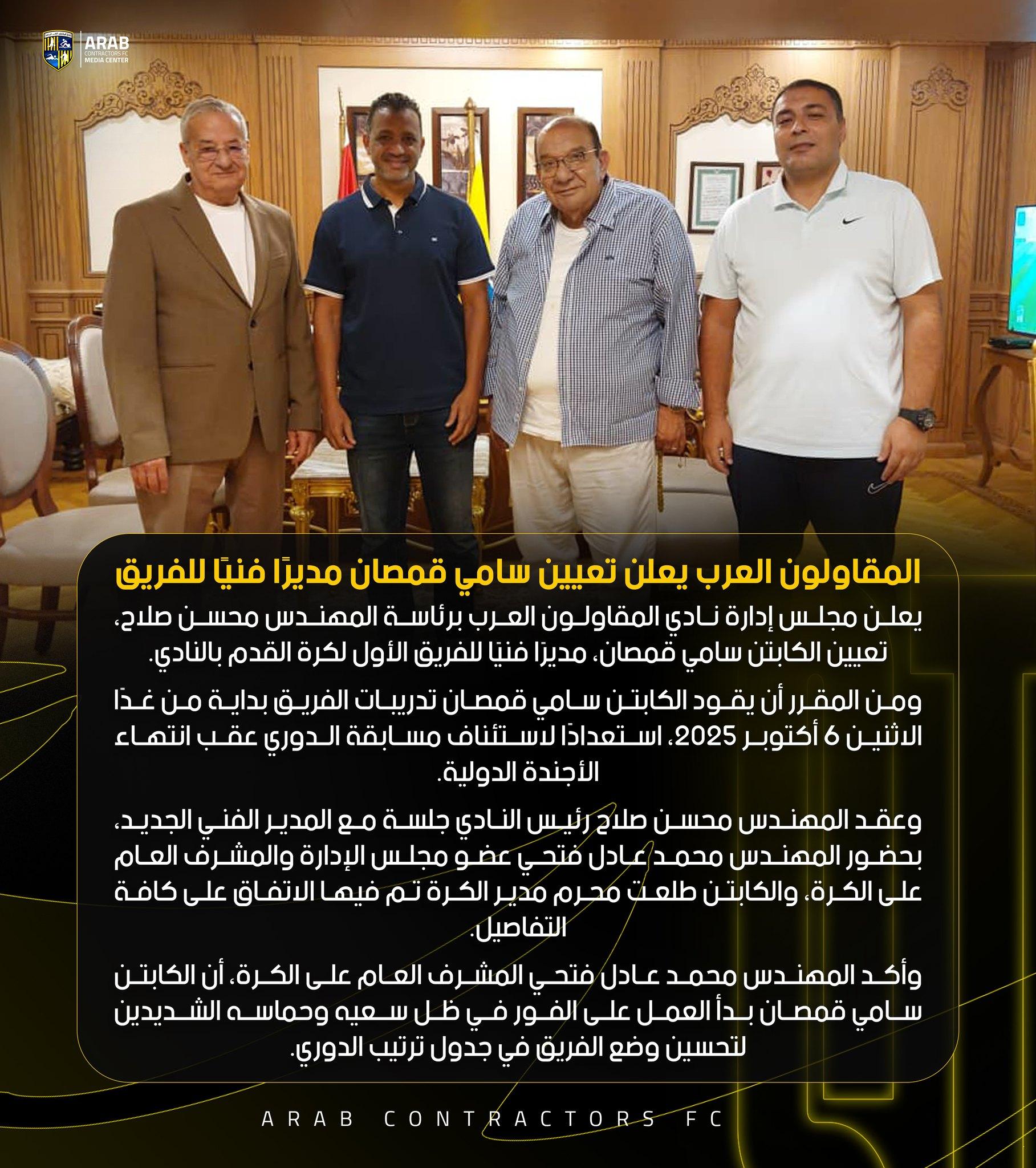 وأكد المهندس محمد عادل فتحي أن الكابتن سامي قمصان بدأ مهمته بالفعل فور الإعلان عن تعيينه، مشيراً إلى أنه يسعى لفتح صفحة جديدة مع اللاعبين وبث روح الحماس داخل الفريق من أجل تحسين النتائج ورفع ترتيب المقاولون العرب في جدول الدوري.