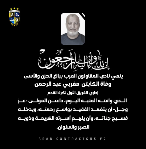 أصدر نادي المقاولون العرب بيان رسمي نعى فيه ببالغ الحزن والأسى وفاة مغربي عبد الرحمن، الإداري بالفريق الأول لكرة القدم بالنادي الذي وافته المنية اليوم.