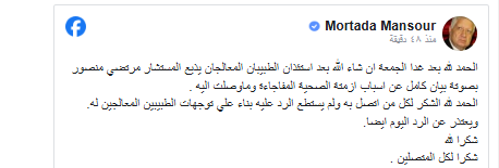 الحمد لله بعد غد الجمعة إن شاء الله بعد استئذان الطبيبين المعالجين يذيع المستشار مرتضى منصور بصوته بيانا كاملا عن أسباب أزمتة الصحية المفاجئة وماوصلت إليه.