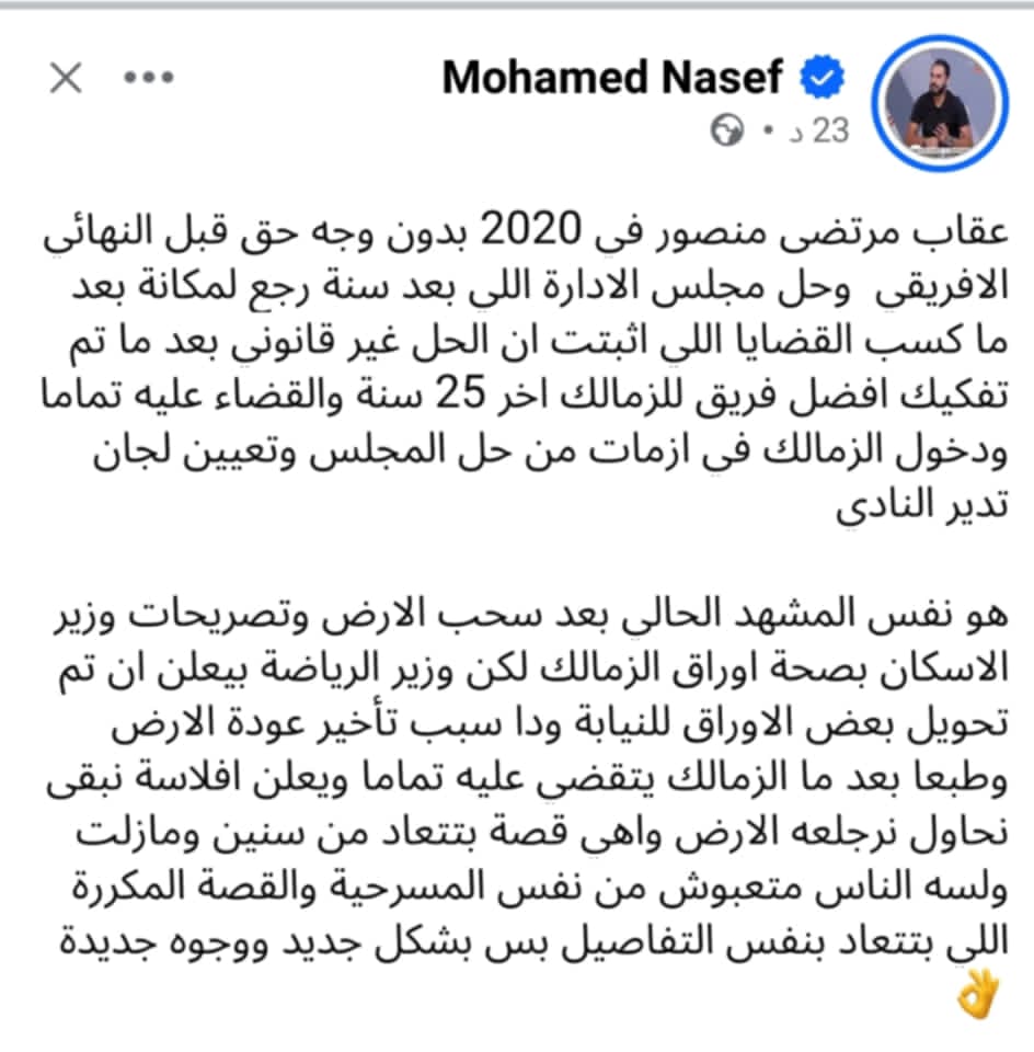 عقاب مرتضى منصور في 2020 بدون وجه حق قبل النهائي الافريقي وحل مجلس الادارة اللي بعد سنة رجع لمكانة بعد ما كسب القضايا اللي اثبتت ان الحل غير قانوني بعد ما تم تفكيك افضل فريق للزمالك اخر 25 سنة والقضاء عليه تماما ودخول الزمالك في ازمات من حل المجلس وتعيين لجان تدير النادي
