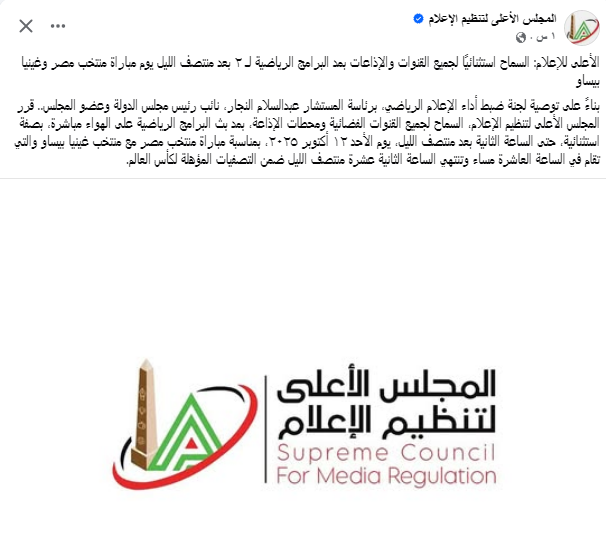 أعلن المجلس الأعلى لتنظيم الإعلام عن السماح الاستثنائي لجميع القنوات الفضائية ومحطات الإذاعة بمد بث البرامج الرياضية المباشرة .