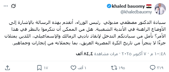 وعبر صفحته الشخصية على موقع التواصل الاجتماعى إكس كتب خالد بيومى مناشداً رئيس الوزراء :