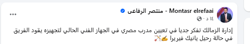 إدارة الزمالك تفكر جديا في تعيين مدرب مصري في الجهاز الفني الحالي لتجهيزه يقود الفريق في حالة رحيل يانيك فيريرا