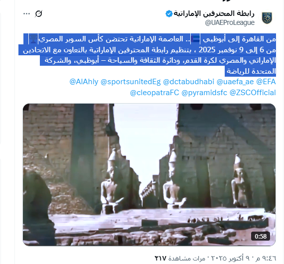 من القاهرة إلى أبوظبي 🇦🇪.. العاصمة الإماراتية تحتضن كأس السوبر المصري من 6 إلى 9 نوفمبر 2025 ، بتنظيم رابطة المحترفين الإماراتية بالتعاون مع الاتحادين الإماراتي والمصري لكرة القدم، ودائرة الثقافة والسياحة – أبوظبي، والشركة المتحدة للرياضة