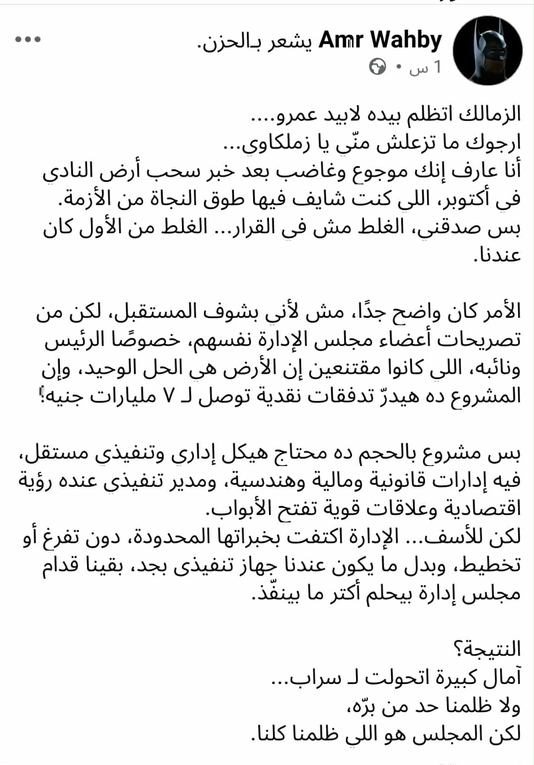 أنا عارف إنك موجوع وغاضب بعد خبر سحب أرض النادي في أكتوبر، اللي كنت شايف فيها طوق النجاة من الأزمة.