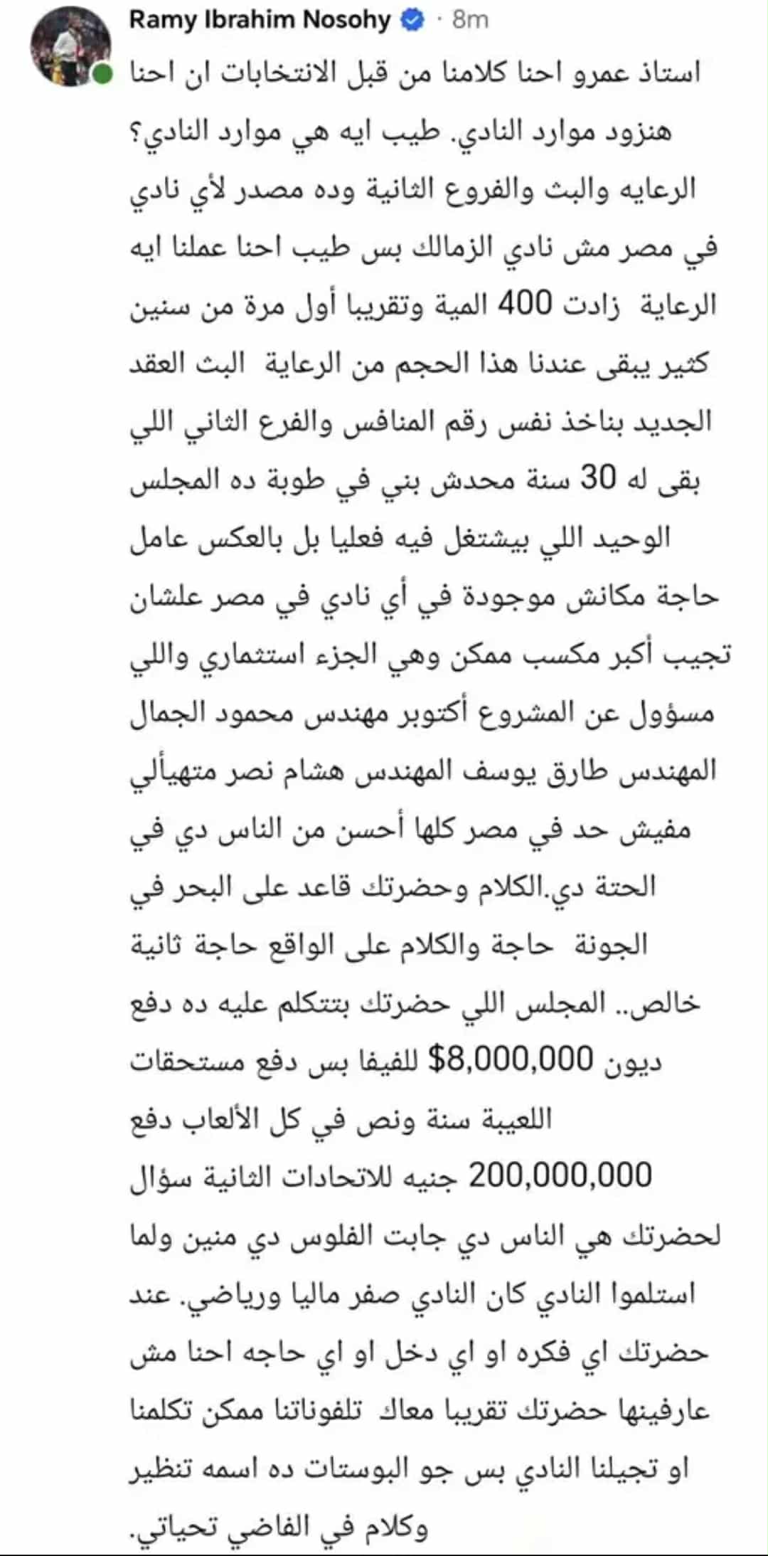 سؤال لحضرتك هي الناس دي جابت الفلوس دي منين ولما استلموا النادي كان النادي صفر ماليًا ورياضيا. عند حضرتك أي فكرة أو أي دخل أو أي حاجة احنا مش عارفينها حضرتك تقريبًا معاك تلفوناتنا ممكن تكلمنا أو تجيلنا النادي بس جو البوستات ده اسمه تنظير وكلام في الفاضي تحياتي.