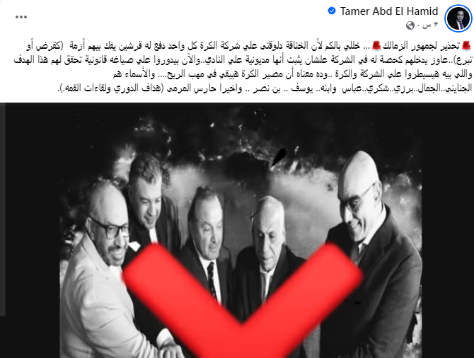 تحذير لجمهور الزمالك... خللي بالكم لأن الخناقة دلوقتى علي شركة الكرة كل واحد دفع له قرشين يفك بيهم أزمة (كقرض أو تبرع)..عاوز يدخلهم كحصة له في الشركة علشان يثبت أنها مديونية علي النادي..والآن بيدوروا علي صياغه قانونية تحقق لهم هذا الهدف واللي بيه هيسيطروا علي الشركة والكرة ..وده معناه أن مصير الكرة هيبقي في مهب الريح....