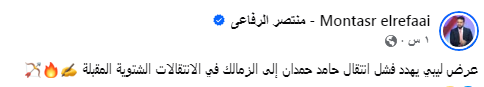 كشف الكاتب الصحفي منتصر الرفاعي عن عرض ليبي يهدد صفقة انتقال حامد حمدان للزمالك.