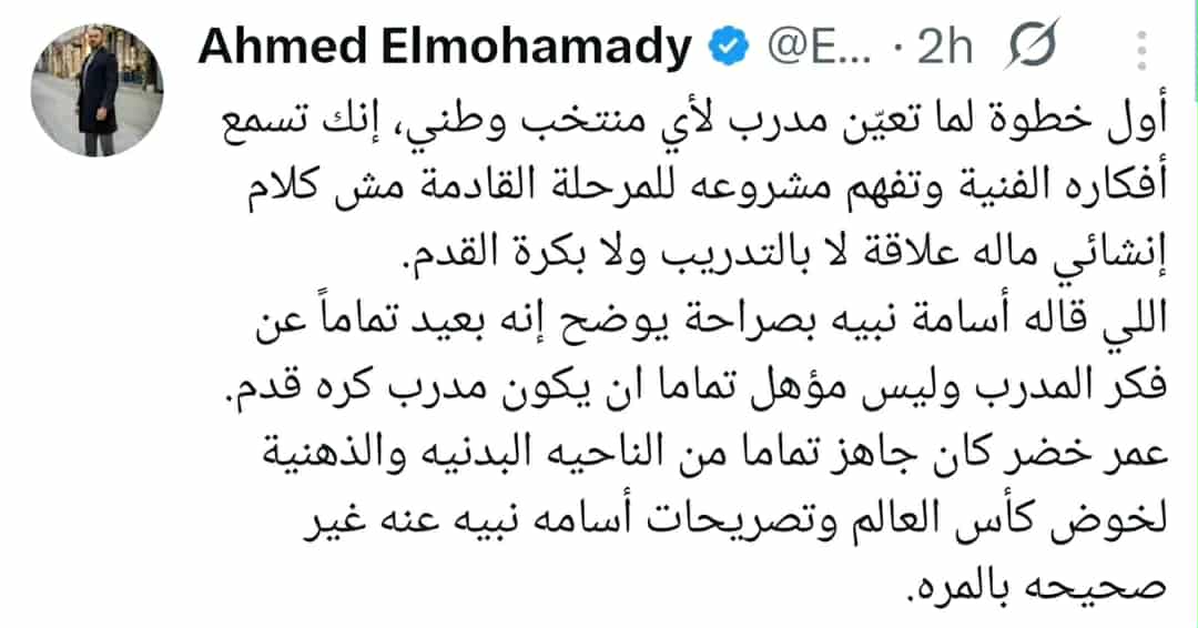 أول خطوة لما تعين مدرب لأي منتخب وطني، إنك تسمع أفكاره الفنية وتفهم مشروعه للمرحلة القادمة مش كلام إنشائي ماله علاقة لا بالتدريب ولا بكرة القدم.