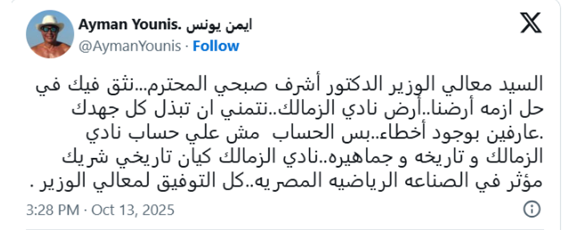 السيد معالي الوزير الدكتور أشرف صبحي المحترم... شقّ فيك في حل أزمة أرضنا.. أرض نادي الزمالك.. نتمنى أن تبذل كل جهدك، عارفين بوجود أخطاء..