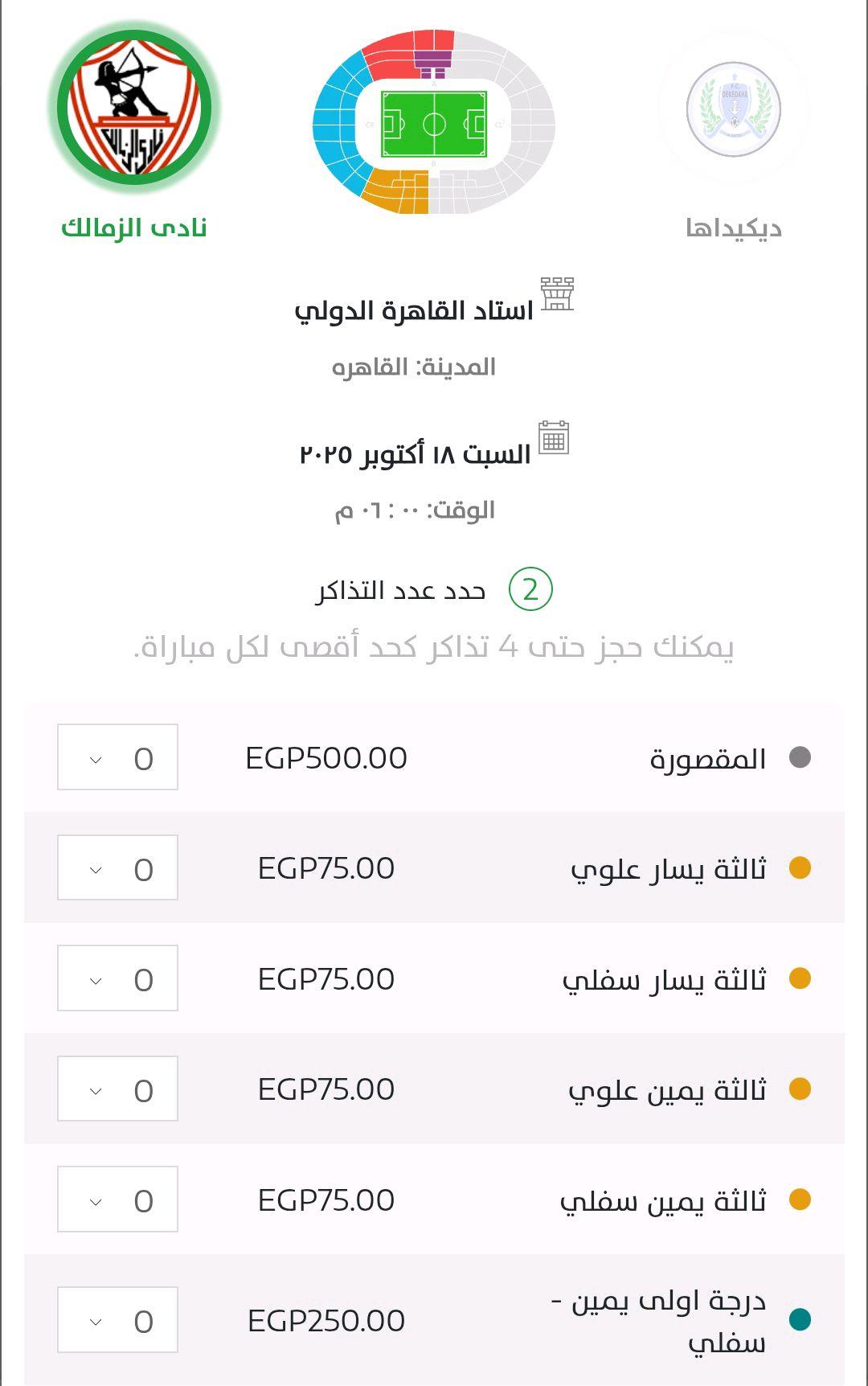أعلنت شركة تذكرتي المسئولة عن تنظيم دخول المباريات التي تنظمها على الاراضى المصرية عن فتح باب حجز تذاكر مباراة الزمالك أمام ديكيداها الصومالي.
