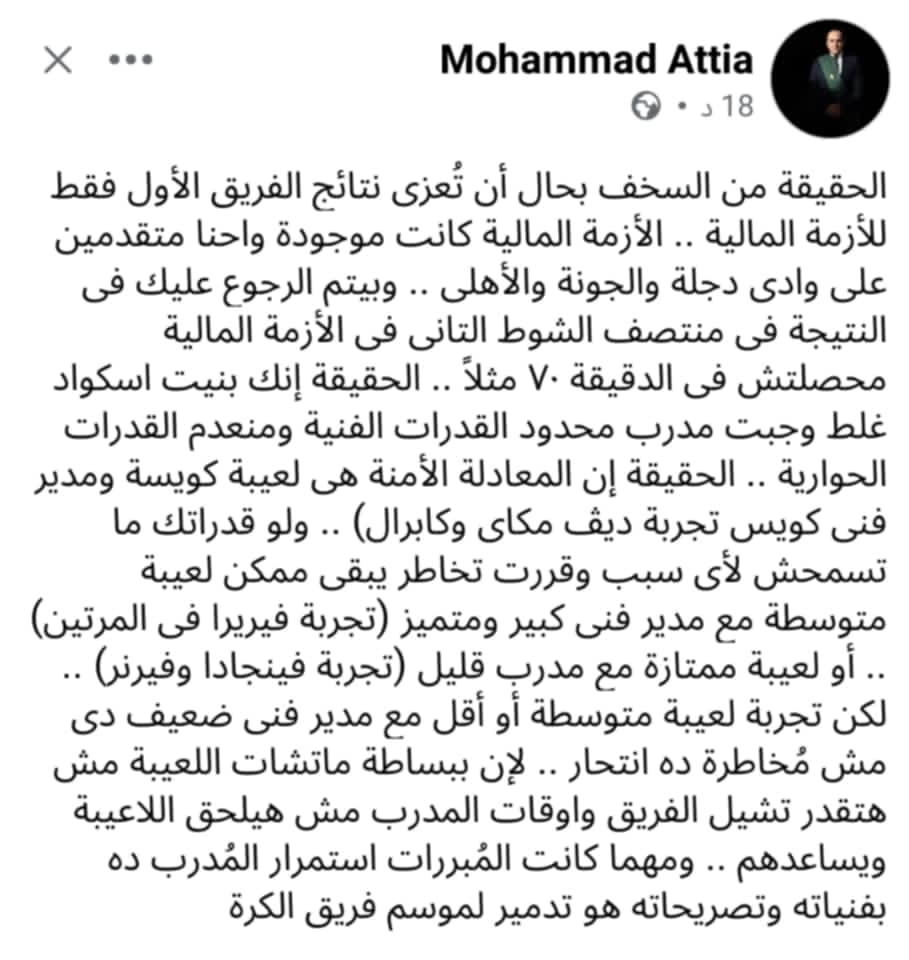 الحقيقة من السخف بحال أن تُعزى نتائج الفريق الأول فقط للأزمة المالية .. الأزمة المالية كانت موجودة واحنا متقدمين على وادى دجلة والجونة والأهلى .. وبيتم الرجوع عليك فى النتيجة فى منتصف الشوط التانى فى الأزمة المالية محصلتش فى الدقيقة ٧٠ مثلاً ..
