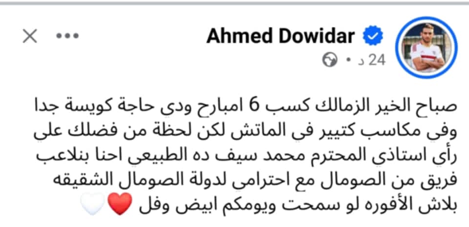 وعبر صفحته الشخصية على موقع التواصل الاجتماعى فيس بوك كتب أحمد دويدار قائلاً :