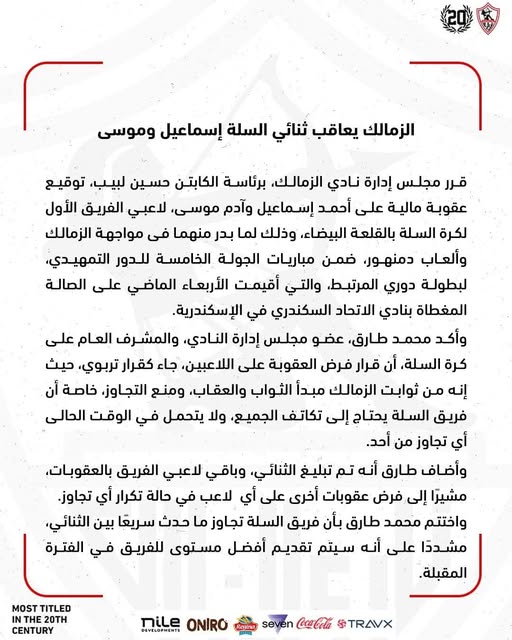 وأوضح طارق أن الثنائي إلى جانب باقي لاعبي الفريق، تم إبلاغهم رسمياً بالعقوبة الموقعة، مع التأكيد على أنه سيتم اتخاذ إجراءات أكثر صرامة حال تكرار أي تجاوزات مستقبلية.