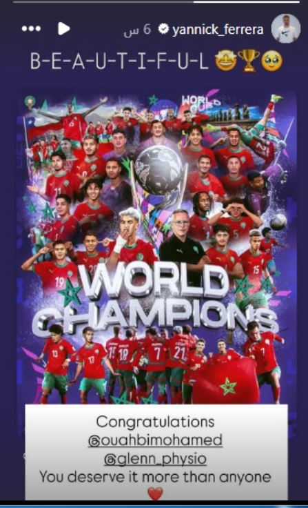 قدم البلجيكي يانيك فيريرا المدير الفني للفريق الأول التهنئة الى محمد وهبي المدير الفني لـ منتخب المغرب للشباب.