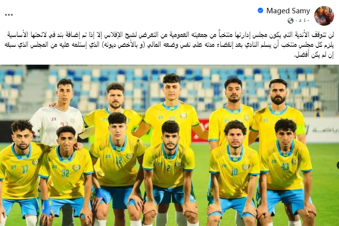 طالب ماجد سامي رئيس نادي وادى دجلة بضرورة وضع بند في اللائحة الأساسية لكل نادي بشأن الوضعية المالية عند استلام مجلس الادارة وعند نهاية دورة المجلس.