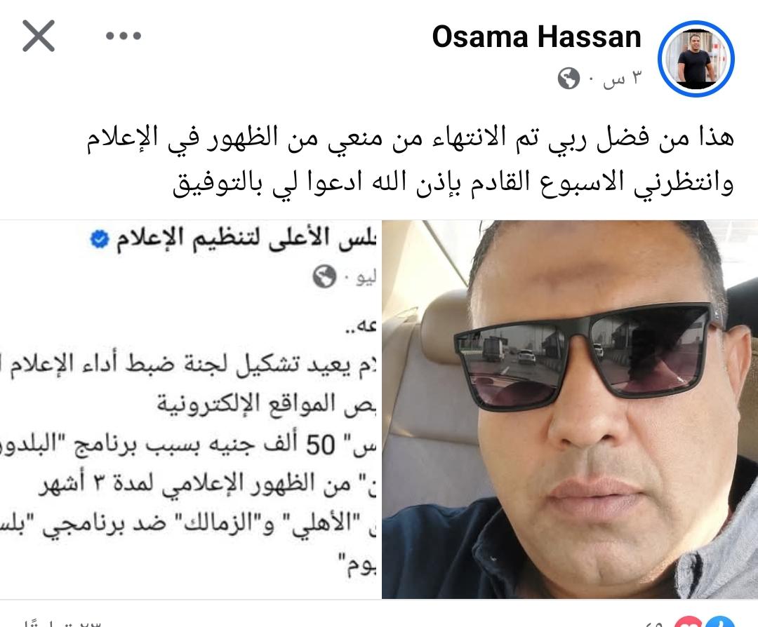 أعلن أسامة حسن نجم نادي الزمالك السابق إنتهاء فترة إيقافه من جانب المجلس الأعلى للإعلام.