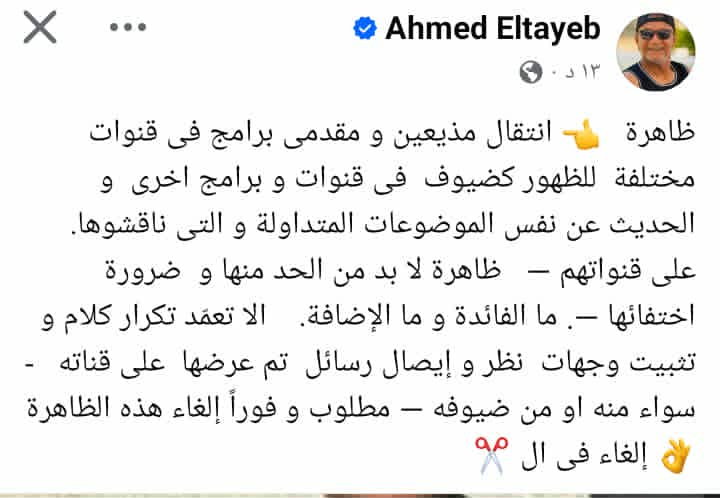 المذيع ضيف فى برنامج تانى، والضيف مذيع فى برنامجه، وأهى جمعية ودايرة على رأى الراحل محمود الجندى فى فيلم الفرح، ليعلق أحمد الطيب على هذا الأمر.