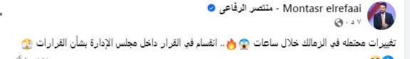 أثار الكاتب الصحفي منتصر الرفاعي الجدل حول تغييرات داخل نادي الزمالك دون الكشف عن طبيعة تلك التغييرات