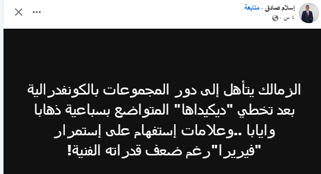 علق الكاتب الصحفي اسلام صادق على تأهل الزمالك دور المجموعات في بطولة الكونفدرالية الأفريقية عقب الفوز اليوم امام فريق نادي ديكيداها الصومالي بهدف للاشئ في اياب دور الـ 32 البطولة