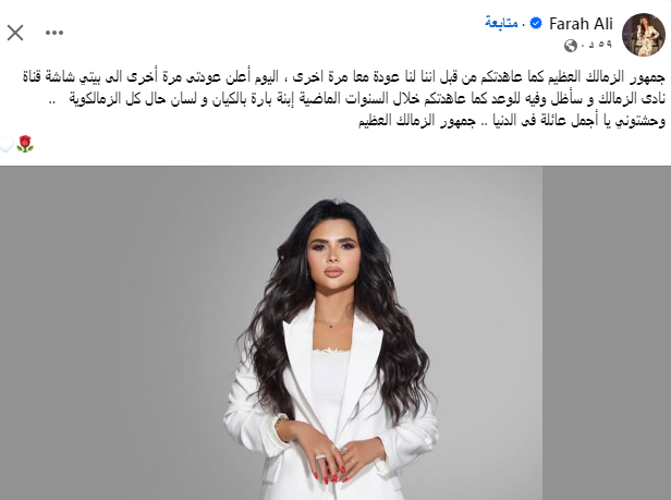 أعلنت الاعلامية فرح على عودتها من جديد الى شاشة قناة نادي الزمالك اعلامية عبر برنامج رسمي.