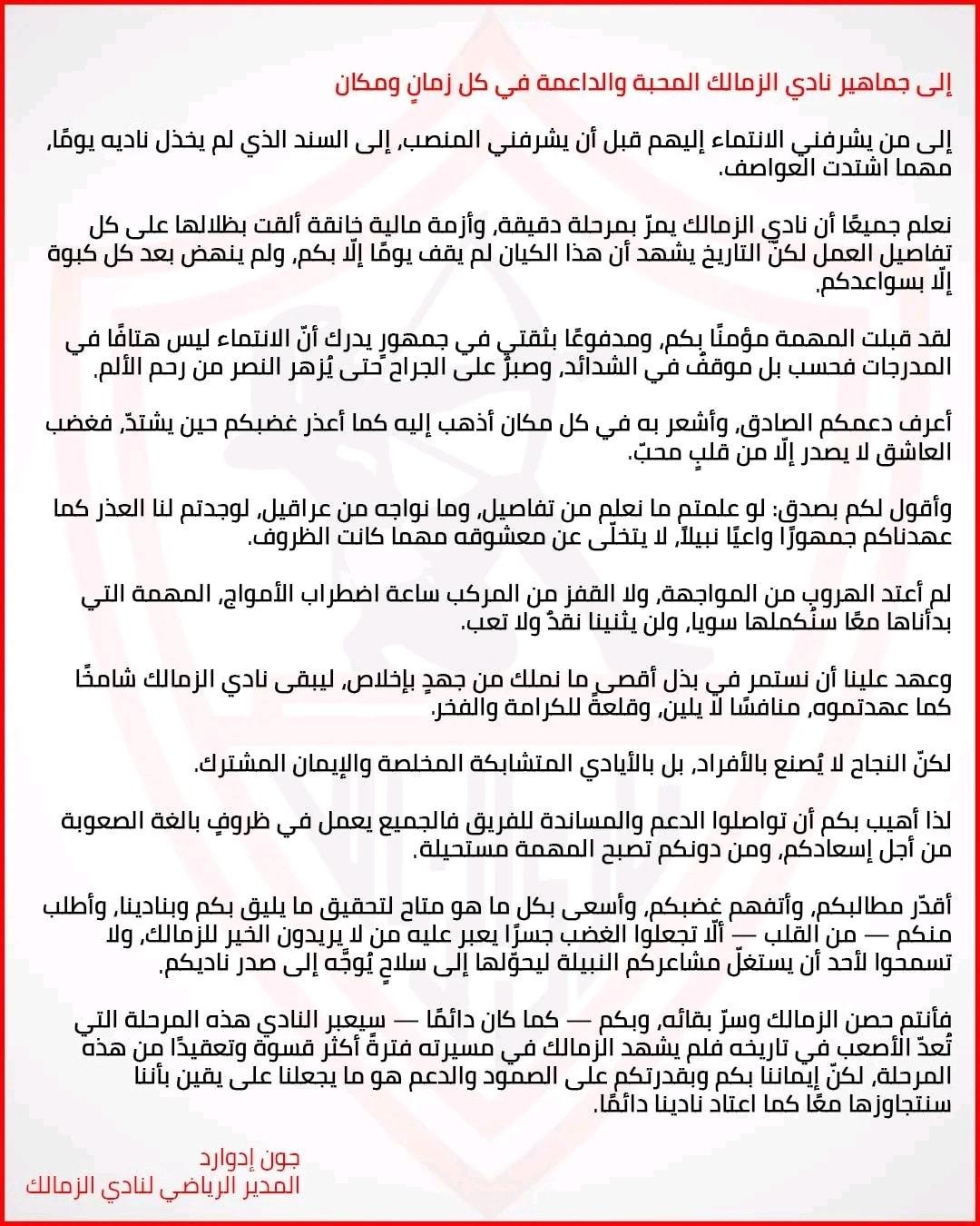 أُقدّر مطالبكم وأتفهم غضبكم، وأسعى بكل ما هو متاح لتحقيق ما يليق بكم وبنادينا، وأطلب منكم – من القلب – ألا تجعلوا الغضب جسراً يعبر عليه من لا يريدون الخير للزمالك، ولا تسمحوا لأحد أن يستغل مشاعركم النبيلة ليحوّلها إلى سلاح يوجه إلى صدر ناديكم.