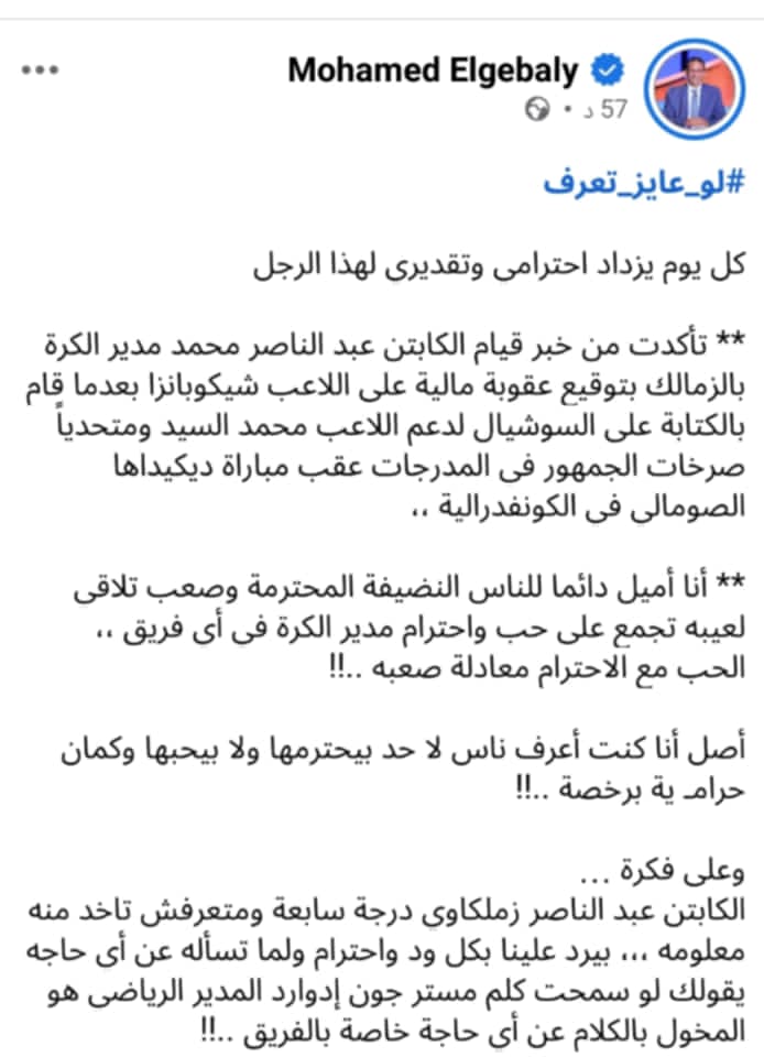 تغنى الناقد الرياضى محمد الجبالى بـ عبد الناصر محمد مدير الكرة بنادى الزمالك.