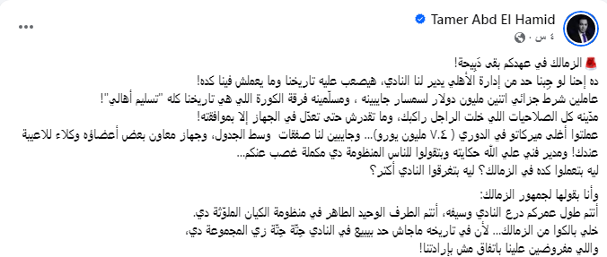 عملتوا أغلى ميركاتو في الدوري ( ٧.٤ مليون يورو)... وجايبين لنا صفقات وسط الجدول، وجهاز معاون بعض أعضاؤه وكلاء للاعيبة عندك! ومدير فني علي الله حكايته وبتقولوا للناس المنظومة دي مكملة غصب عنكم...