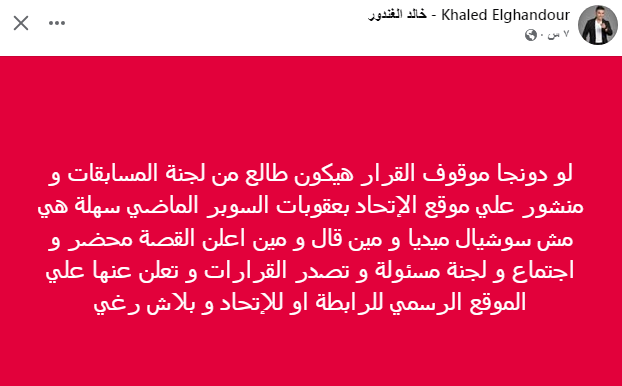 لو دونجا موقوف القرار هيكون طالع من لجنة المسابقات و منشور علي موقع الإتحاد بعقوبات السوبر الماضي سهلة هي مش سوشيال ميديا و مين قال و مين اعلن القصة محضر و اجتماع و لجنة مسئولة و تصدر القرارات و تعلن عنها علي الموقع الرسمي للرابطة او للإتحاد و بلاش رغي