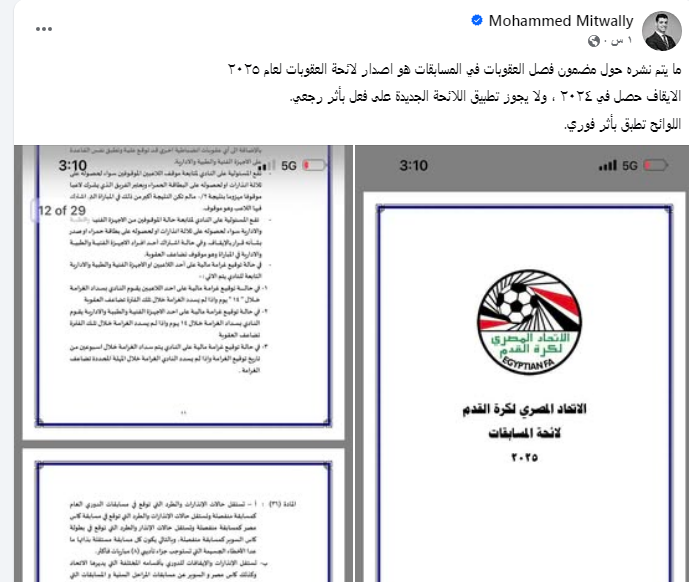 حيث تحدث المستشار محمد متولي أن الجدل حول العقوبات يستند إلى لائحة المسابقات لعام 2025، مشددًا على أن العقوبة وقعت في عام 2024.