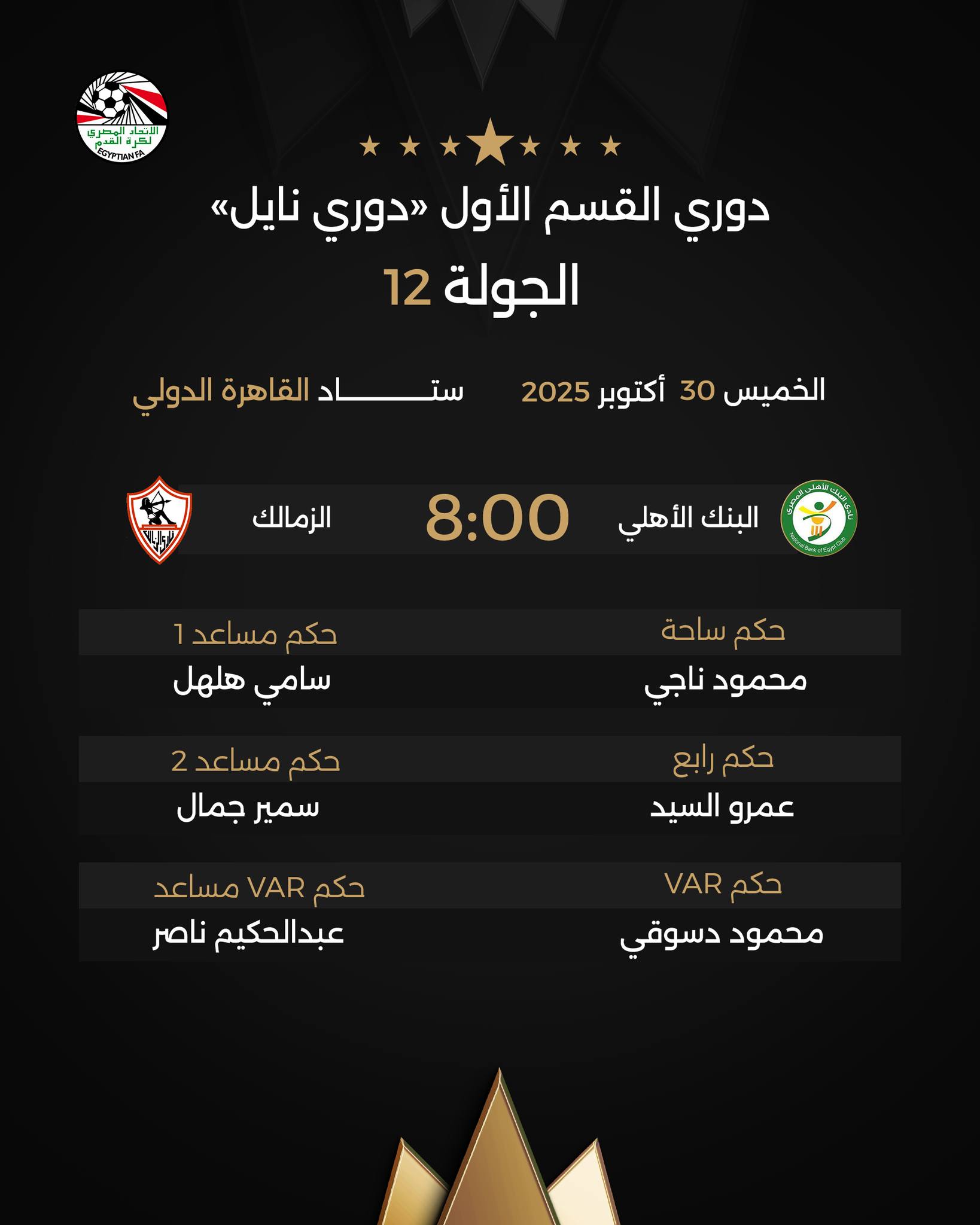 أعلن الاتحاد المصري لكرة القدم عن طاقم تحكيم مباراة الزمالك والبنك الأهلي غدا الخميس.