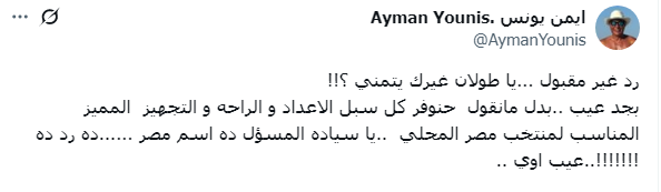 وتابع: بجد عيب ..بدل مانقول حنوفر كل سبل الاعداد و الراحه و التجهيز المميز المناسب لمنتخب مصر المحلي ..يا سياده المسؤل ده اسم مصر ......ده رد ده !!!!!!!..عيب اوي ..
