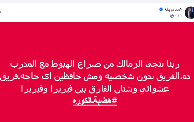 عماد دربالة انتقد فيريرا مدرب الزمالك بقوة وعلق عبر حسابه على موقع التواصل الاجتماعي فيسبوك قائلا: