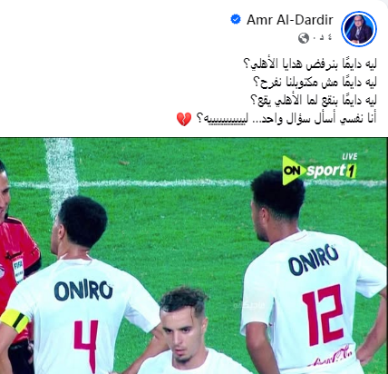 الناقد الرياضي عمرو الدردير علق عبر حسابه على موقع التواصل الاجتماعي فيسبوك قائلا: