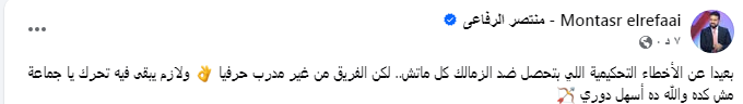 الناقد الرياضي منتصر الرفاعي علق عبر حسابه على موقع التواصل الاجتماعي فيسبوك قائلا: