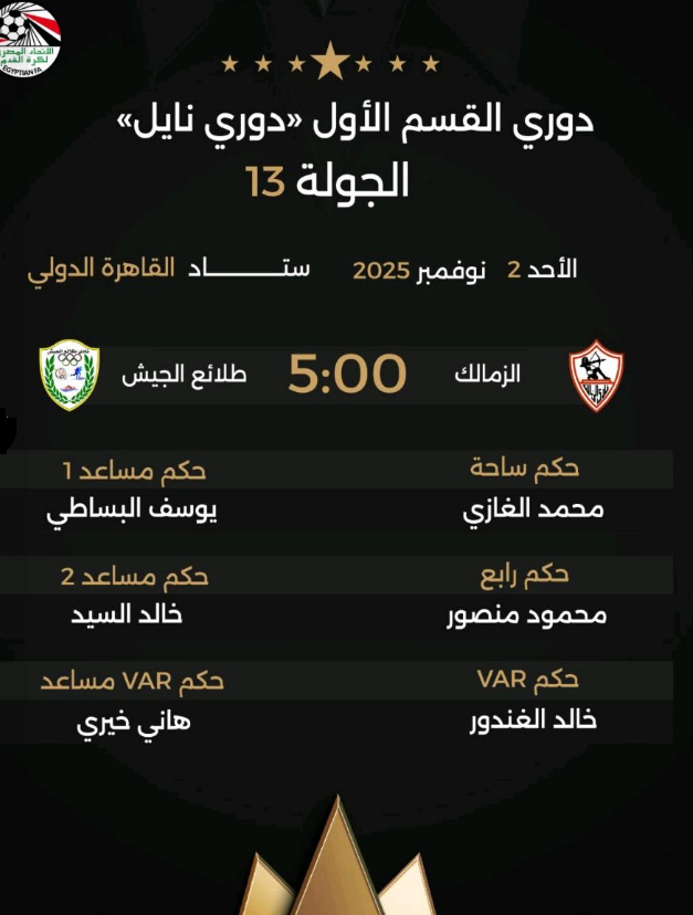 أعلنت لجنة الحكام بالاتحاد المصري عن طاقم التحكيم مباراة الزمالك وطلائع الجيش القادمة فى بطولة الدورى العام.