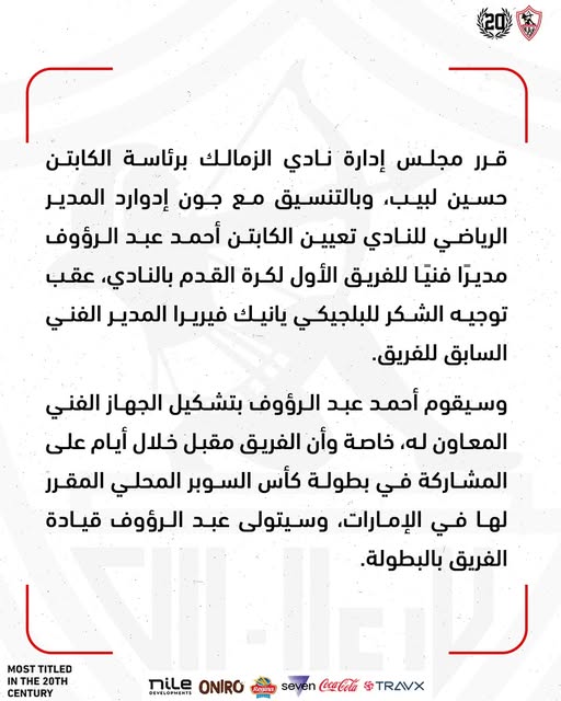 قرر مجلس إدارة نادي الزمالك برئاسة الكابتن حسين لبيب، وبالتنسيق مع جون إدوارد المدير الرياضي للنادي، تعيين الكابتن أحمد عبد الرؤوف مديرًا فنيًا للفريق الأول لكرة القدم، وذلك عقب توجيه الشكر للمدرب البلجيكي يانيك فيريرا وجهازه المعاون.