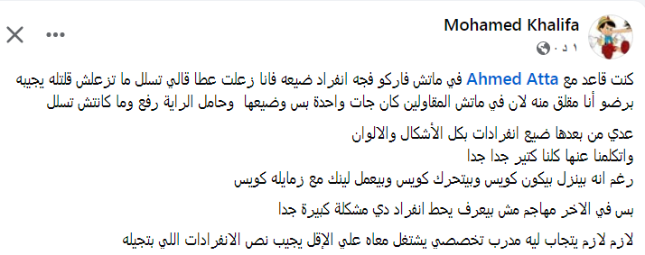 لازم لازم يتجاب ليه مدرب تخصصي يشتغل معاه علي الإقل يجيب نص الانفرادات اللي بتجيله