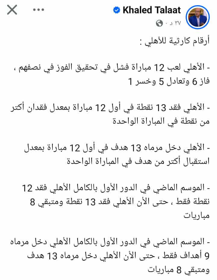 كشف الناقد الرياضى خالد طلعت المحسوب على النادى الأهلى عن أرقام كارثية للفريق هذا الموسم.