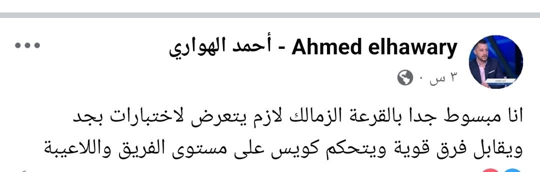 انا مبسوط جدا بالقرعة الزمالك لازم يتعرض لاختبارات بجد ويقابل فرق قوية ويتحكم كويس على مستوى الفريق واللاعيبة