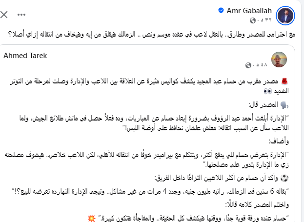 علق الناقد الرياضي عمرو جاب الله على ما خرج على لسان مصدر مقرب من حسام عبد المجيد لاعب الزمالك